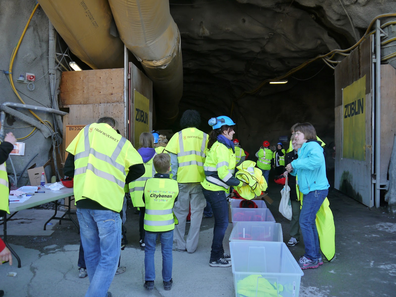 Tror att få kvinnor arbetade i tunnelbygget men nu fanns de med i samma uniform som goda informatörer, väl insatta i bygget. Hade turen att få sällskap med en som såg att jag ville fotografera och var både nyfiken och frågvis. Till vardags arbetade hon administrativt, men var då och då ner i tunnlarna.