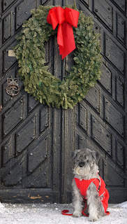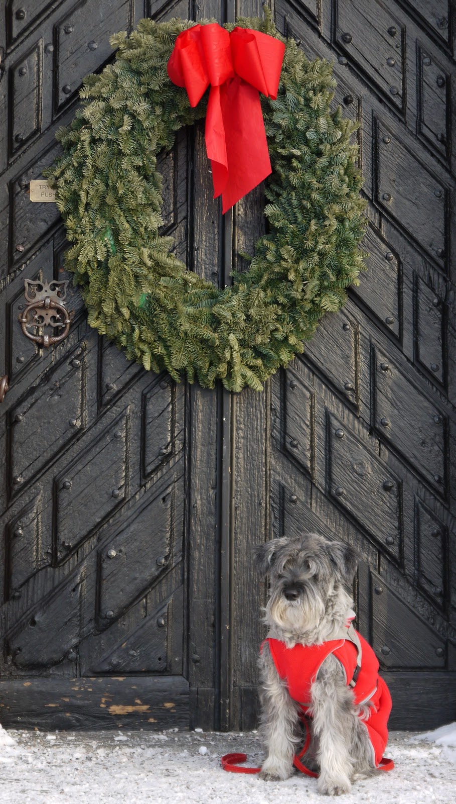 Snön lär väl ligga kvar, så det är bäst att packa ner broddarna. På ”vischan” ser det ju lite annorlunda ut. Men några goa promenader ska det väl kunna bli. OK annars får vi väl ta en tur i Sundbyholms Slottspark. Där lilla Mollan fick posera under en av de gamla julsmyckade ekportarna.
