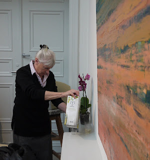 Många besökare minglade och beskådade konstverken. En hel del vänner och kollegor, glädjande nog, även många i från mitt område Aspudden/Örnsberg, där Bosse var en känd profil i gatubilden. Det som fascinerar mig som betraktare och amatör är att det finns så många olika sätt att tyda Bosse konst! ”Man hittar det man vill hitta”! Helt plötsligt finns där en liten ”fläck” i gult, orange eller rosa.
