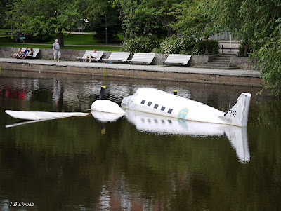 En DC 3:a har nödlandat i vallgraven utanför slottet, kan det vara möjligt? Men det lär har hänt under 2:a världskriget. Den svenske konstnären Göran Hägg har återskapat den bisarra bilden.