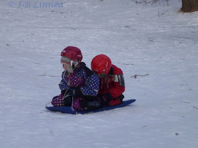 Det är så skojsigt för barnen att det finns snö så de har ”något-att-göra”. När det slaskar och blaskar så sitter de nog inne mest. Jag brukar slänga mig nerför backen med mina barnbarn. Elsa och Linnea som nu är 4,5 brukar skratta gott när farmor skriker se upp därnere det blir sju hål i nacken ,-))