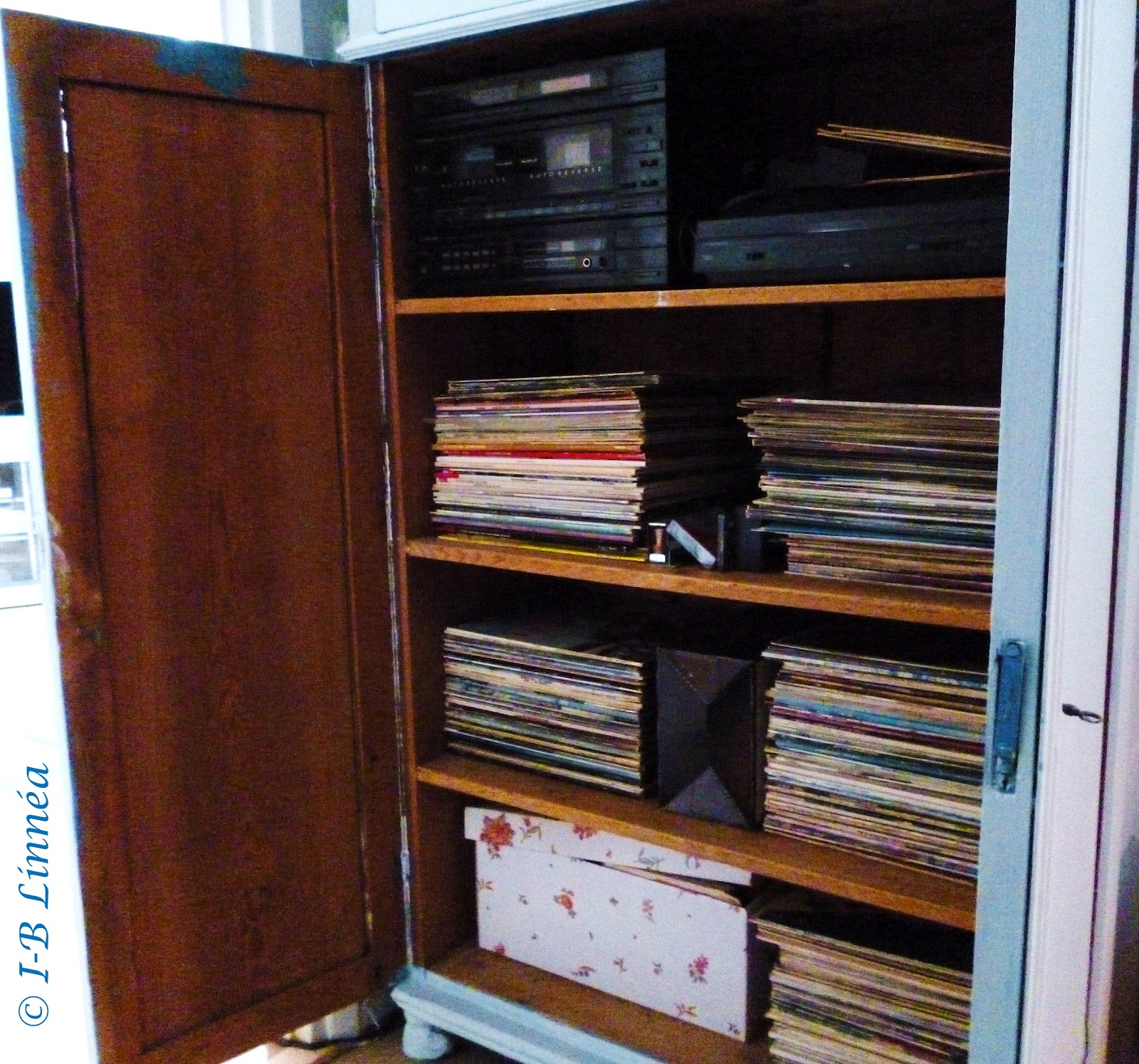 Det här är en ”hemlig gömma”, i denna gamla köksskänk finns det mesta klart att användas för en nostalgitripp. Singlar, EP, LP till och med några stenkakor. Stereon finns kvar och sladdarna till högtalarna går ut genom hål på baksidan. Rock, Soul, Jazz, Disco, Klassiskt, visst! Älskar denna samling!