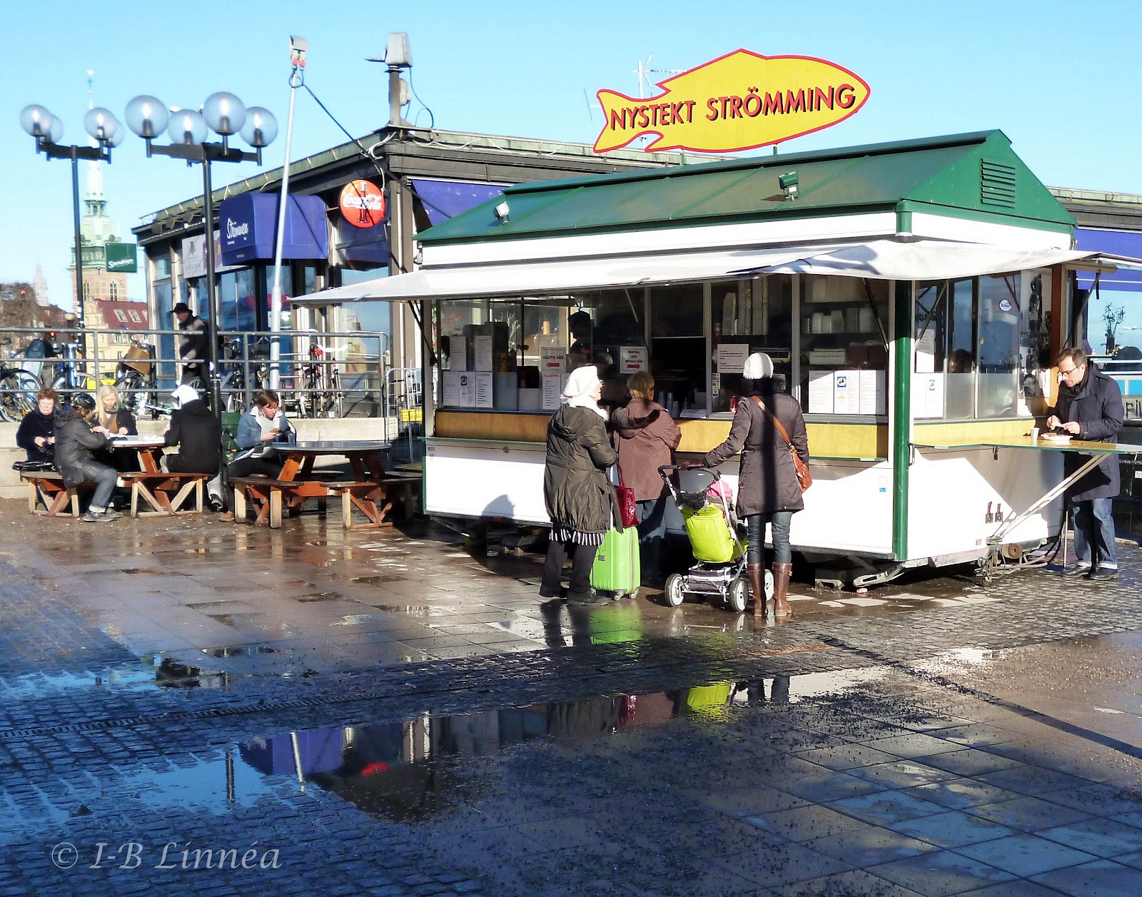 Lite glädje må denna bild sprida, Slussen i Stockholm, strömmingsståndet. Kolla isen smälter och människor njuter sin lunch utomhus!